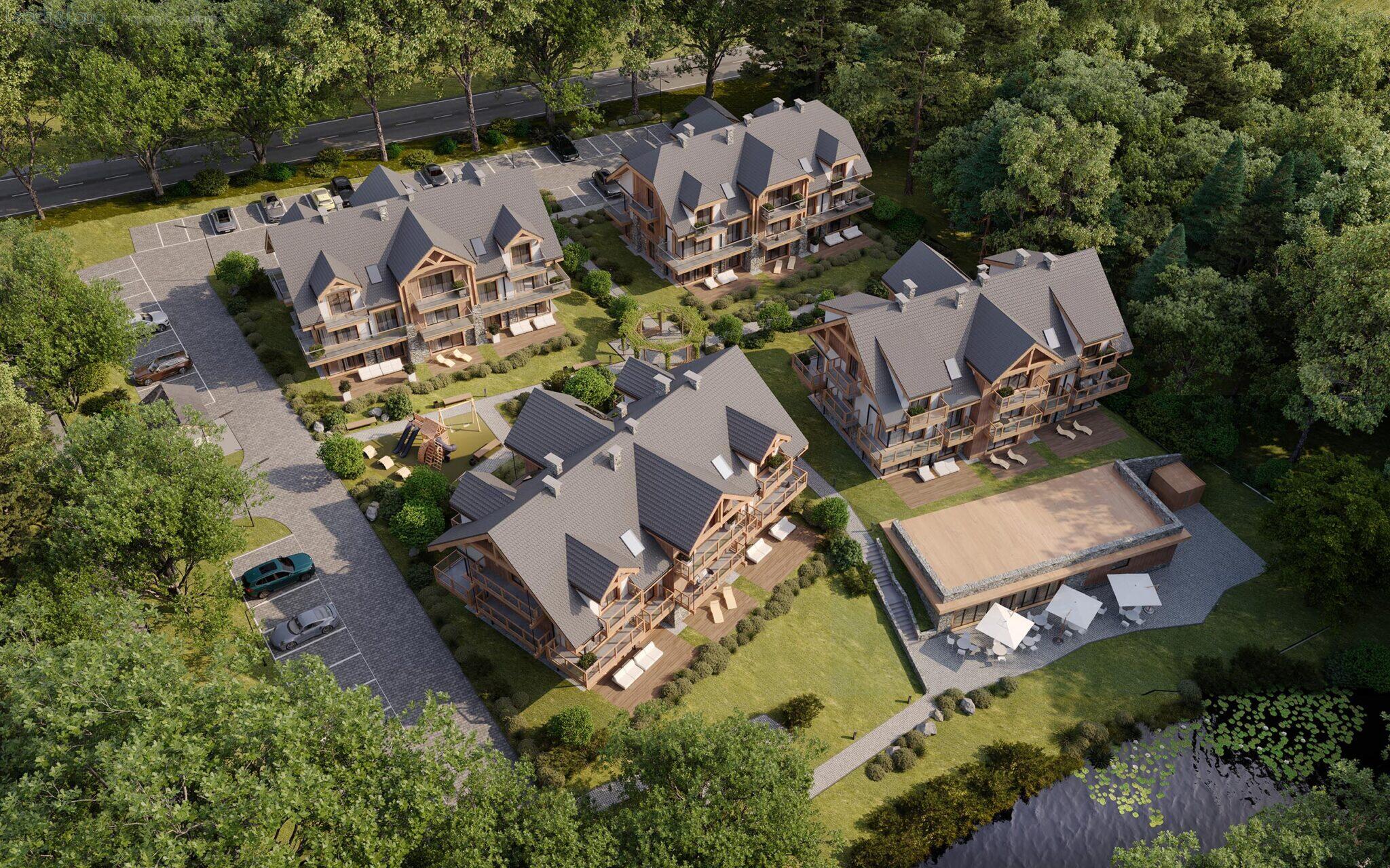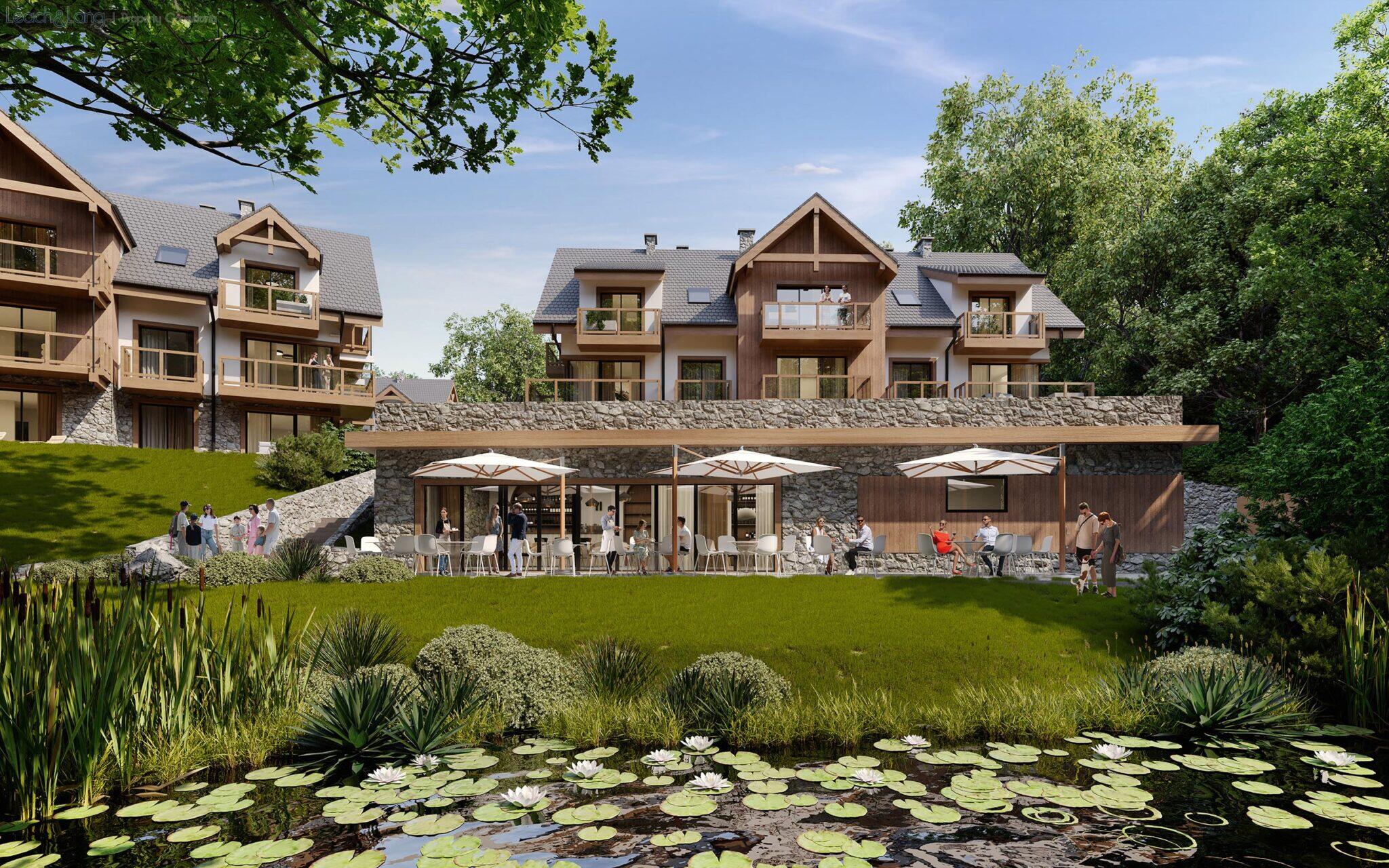 Na terenie inwestycji przewidziano liczne udogodnienia dla mieszkańców i gości, m.in.: zielone patio, strefę relaksu z sauną i balią, plac zabaw, wiatę rowerową oraz restaurację z widokiem na góry i potok.