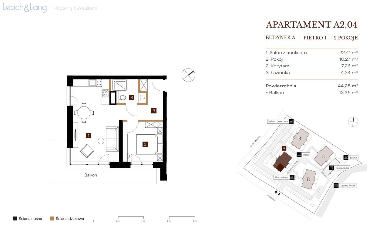 Prezentowany apartament ma powierzchnię 44,28 m2 i znajduje się na 1 piętrze budynku. Funkcjonalny układ obejmuje: