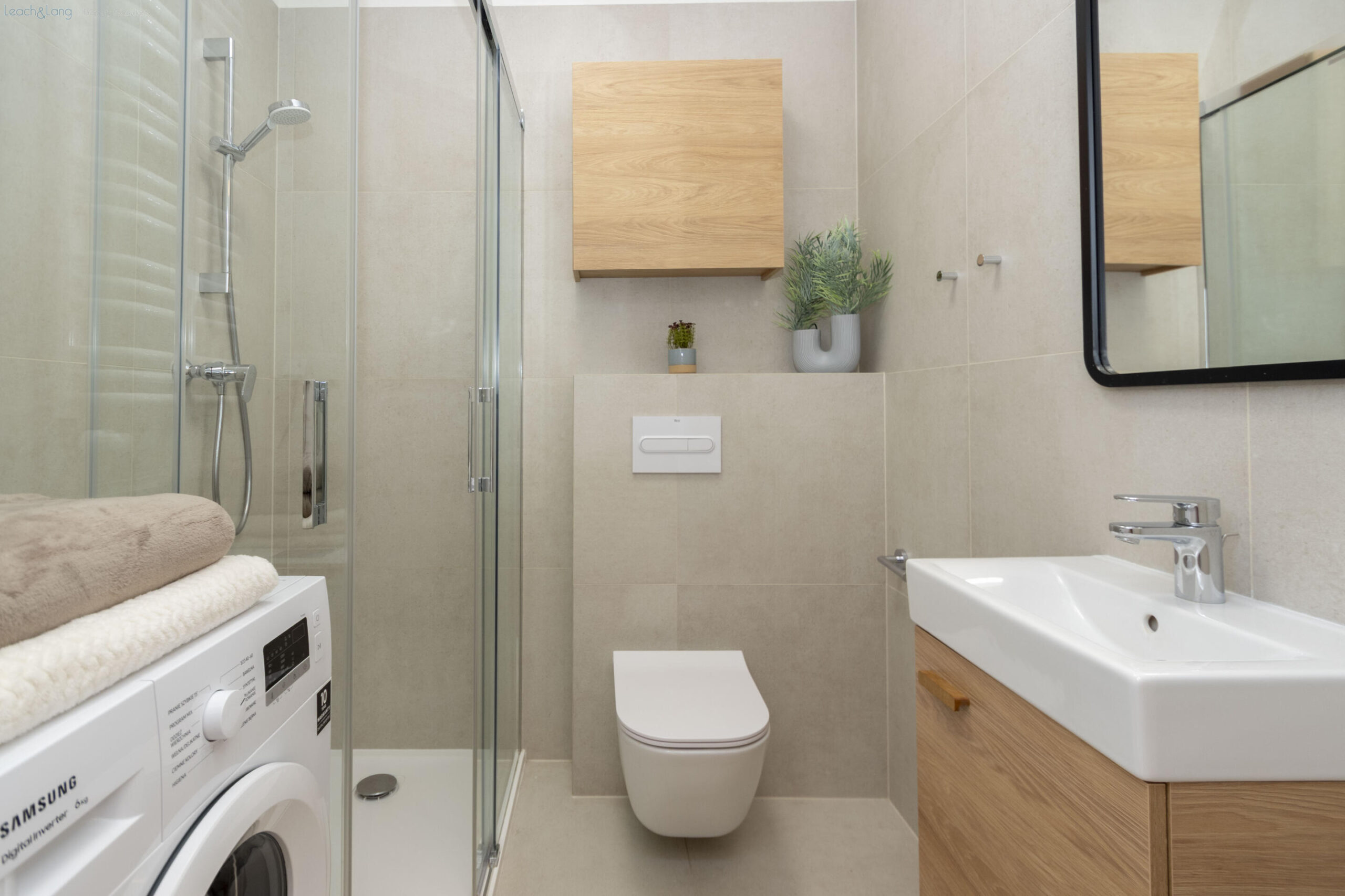 - łazienki z kabiną prysznicową, wyposażoną także w pralkę.