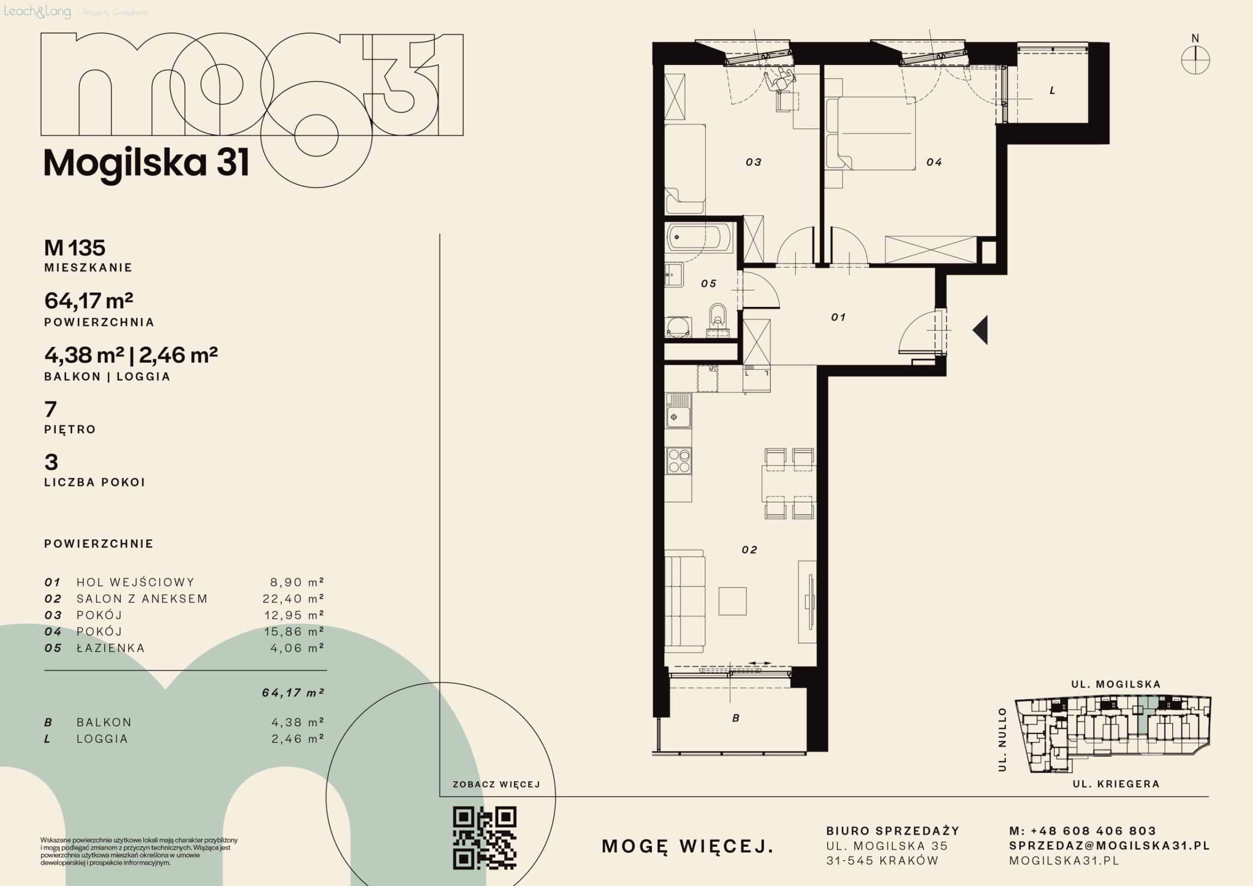 Lokalizacja przy ul. Mogilskiej zapewnia szybki dojazd do centrum miasta oraz wygodny dostęp do punktów handlowo-usługowych, biur i terenów rekreacyjnych. Jest to dynamicznie rozwijający się obszar Krakowa, chętnie wybierany zarówno do zamieszkania, jak i pod inwestycję.